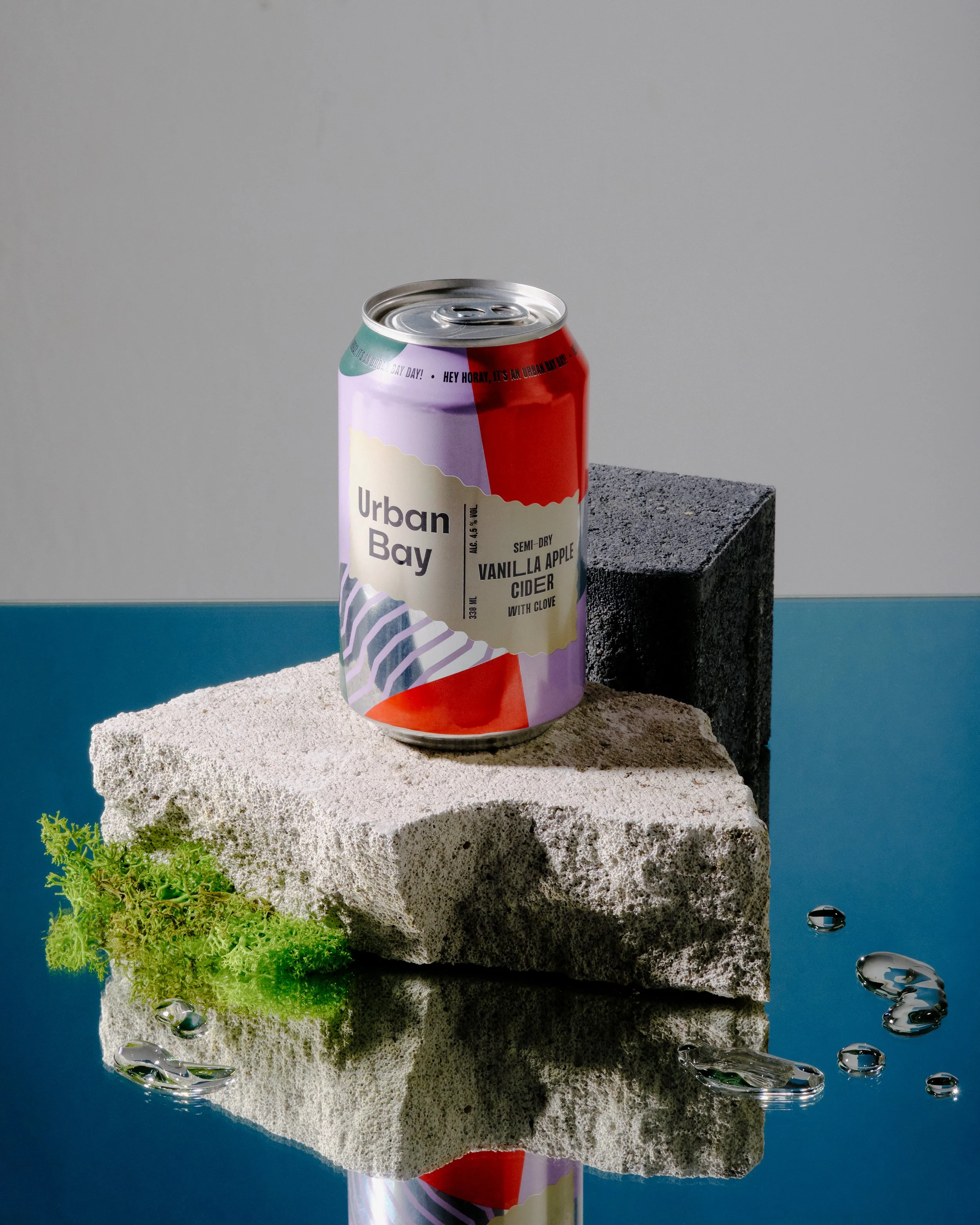The initial brief from Olvi included a detailed analysis of the cider market, identifying a gap where the competition was heavily focused on heritage, earthy tones, and tradition. Recognizing this unique opportunity, we crafted Urban Bay—a brand that breaks away from convention with an attention-grabbing, playful design, a bold color palette, and quirky typography.